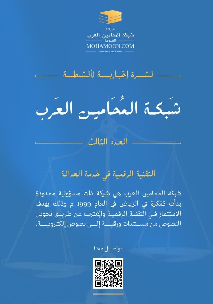 يسر شبكة المحامين العرب أن تعلن عن إطلاق " خدمة تحضير الأسانيد القانونية " والتى تقوم على مفهوم جديد لفلسفة الخدمة لدى الشبكة، ذلك من خلال المشاركة والتفاعل مع أعضاء الشبكة الكرام ، من خلال المساعدة في البحث وتأصيل المعلومة القانونية عبر مختصين من مستشاري الشبكة القانونيين.