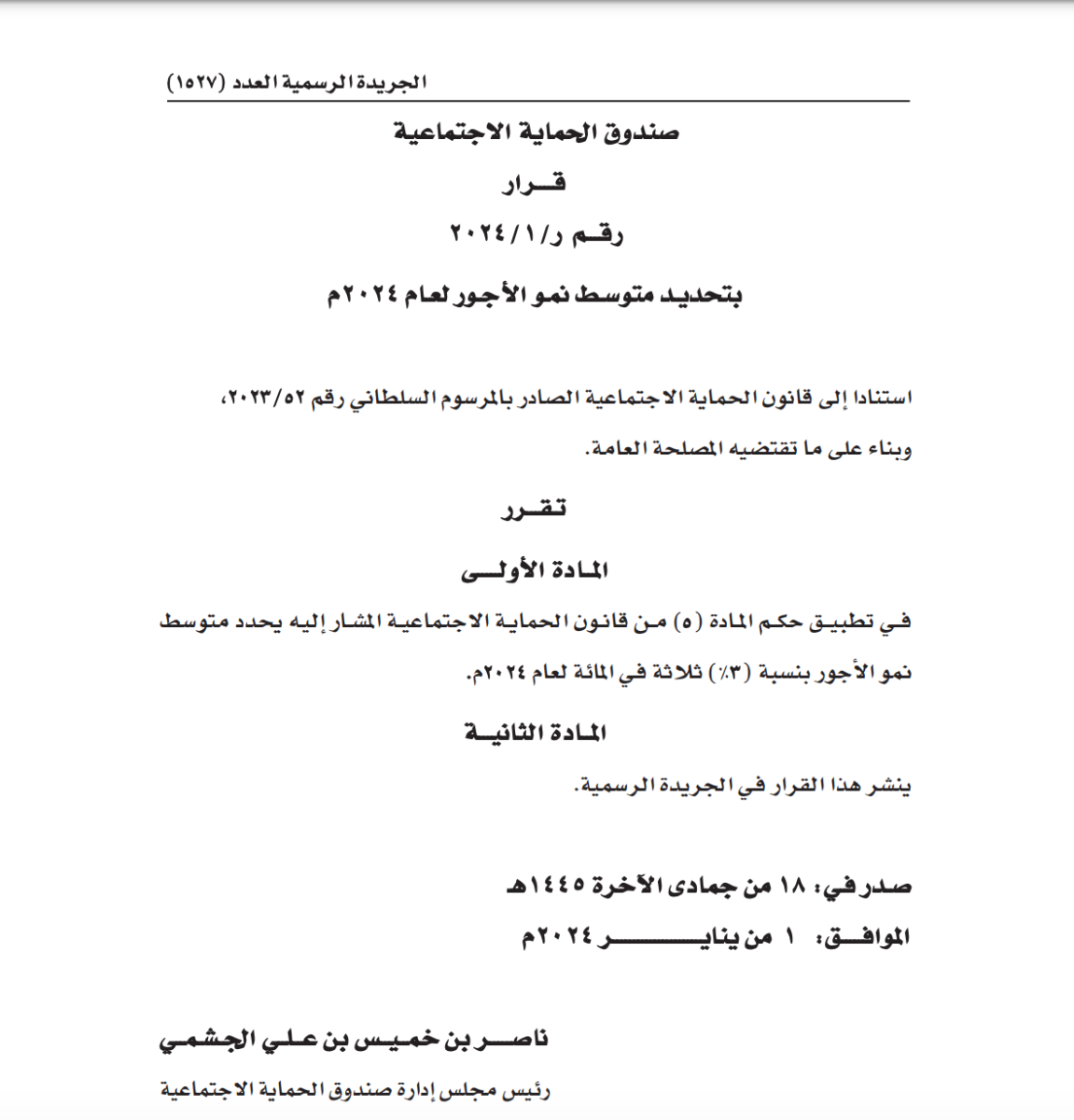 الاجتماعية قراًرًا بتحديد متوسط نمو الأجور بنسبة ٣٪ لعام ٢٠٢٤ وذلك وفقًا